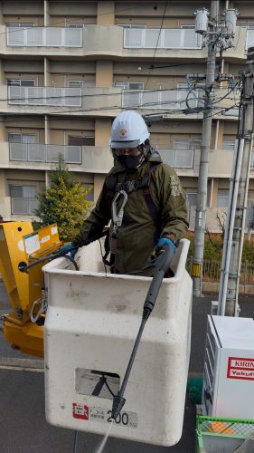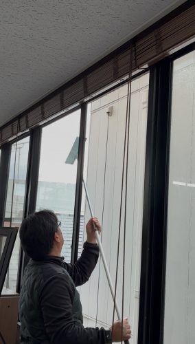 窓ガラスは高所作業車を使用し、本格的にピカピカに✨